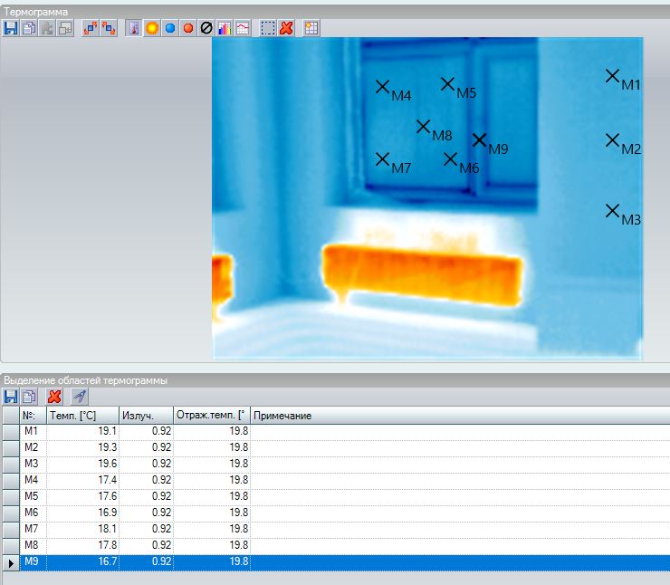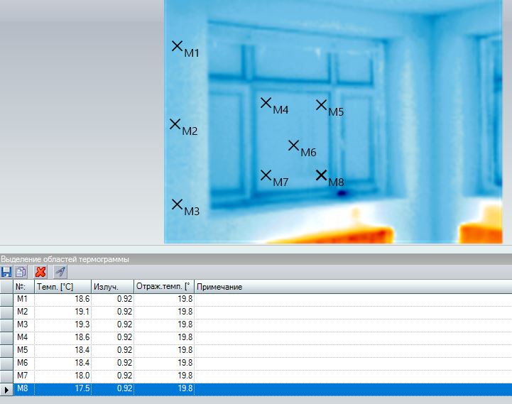 Температура наружного воздуха -14.2 Температура внутри +20 Стена Штукатурка ЦПС 20 мм, Кирпич полнотелый 510мм, минвата 180 мм, вентфасад R=(1/8,7+0,02/0,93+0,51/0,81+0,18/0,039+1/10,2)*0,85=3.56 Температура стены средняя 19 градусов Расчётное сопротивление стены по замерам (20-(-14.2))/((20-19)*8,7)=3,93 (3.747 по другому замеру Тнар) Температура двух стеклопакетов средняя 17.87 Расчётное сопротивление стеклопакетов по замерам (20-(-14.2))/((20-17.2)*8,7)=1.403 (1,338 по другому замеру Тнар) Трехкамерный стеклопакет с аргоном и двумя теплоотражающими покрытиями, производитель заявлял сопротивление 1,34 На часть стеклопакетов клеил бумагу что бы коэффициент отражения был 0.92 вроде как по факту на снимках не смог найти её.