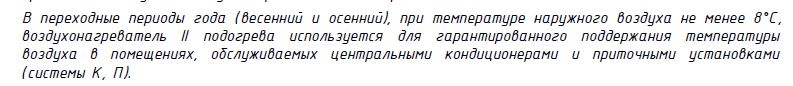 А то что в таблице выше было написано +8..+18 водяной калорифер, так это может быть ошибка проектировщика при копипастинге. А почему тогда делают и во многих проектах я видел что водяной именно на межотопительный период, и до меня так делали в организации где я сейчас работаю. То что я прикрепил - там в 1 подогреве нагревают до +8 и догревают до +20 во втором, так же второй нагрев работает на межотопительный период (прикреплина же вырезка из общих данных). У нас делали по другому: в первом нагревали до +20 в отопительный период, во втором до +20 в межотопительный период. Схема ГВС закрытая, иногда бывает собственный источник - котельная 1 категории. Ок Хитрый лист - вторая часть вопроса - отопительный период - 2 нагрева и каждый отдельно от ИТП - зачем - 4 трубы, 2 отдельных блока в ИТП?(Усложню вопрос: ок, есть увлажнение, после которого необходимо догревать приточный воздух - зачем тянуть отдельную ветку и оставить отдельный блок 2 подогрева в ИТП? Почему нельзя притянуть 2 трубы из ИТП и разъеденить на 1 и 2 подогревы в приточной венкамере?)