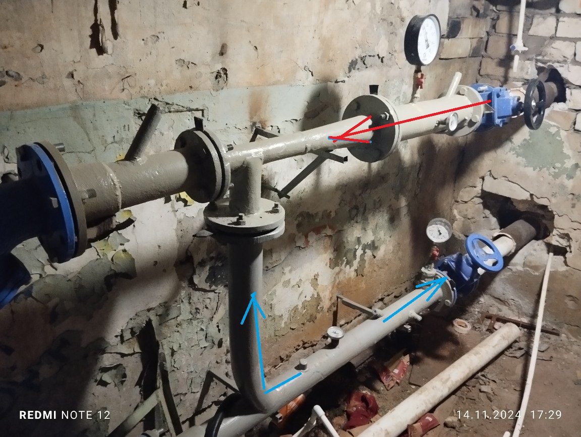 Цитата(SaVikK @ 15.11.2024, 8:17)  В результате насколько я вижу: 1) неправильно установлен элеватор с трубопроводом на смешение - прошу подсказать, какие последствия из-за этого и прав ли я; 2) отсутствует перепад на подаче и обратке - по 6 кгс/см2. Скорее всего проблема в тепловых сетях, так как в соседнем доме (питаемся от одной магистрали) таже ситуация, на подаче и обратке 6,0 кгс/ см2. Должен быть (читал в инете 1,5 - 2 кгс/см2), так или нет? Насколько я понимаю, теплосети на фото 1 слева, а справа трубы в домовую сеть. Тогда по верхней трубе теплоноситель (подача) идет слева направо, обратка по нижней - справа налево. Тут все правильно. Ваши стрелки показывают наоборот - теплосети якобы справа, домовые трубы слева... Хотелось бы уточнить... По давлению - да, должен быть перепад минимум 1 кгс/см2. Иначе циркуляции не будет нормальной и есть шанс, что поток будет уходить в "сапог" - кстати, очень хорошо было бы проверить температуры до "сапога" и после, они четко покажут, есть опрокидывание или нет. Слева (частично в первом кадре) грязевик вроде бы, возможно (плохо видно) установлен против потока и тем самым снижает перепад...