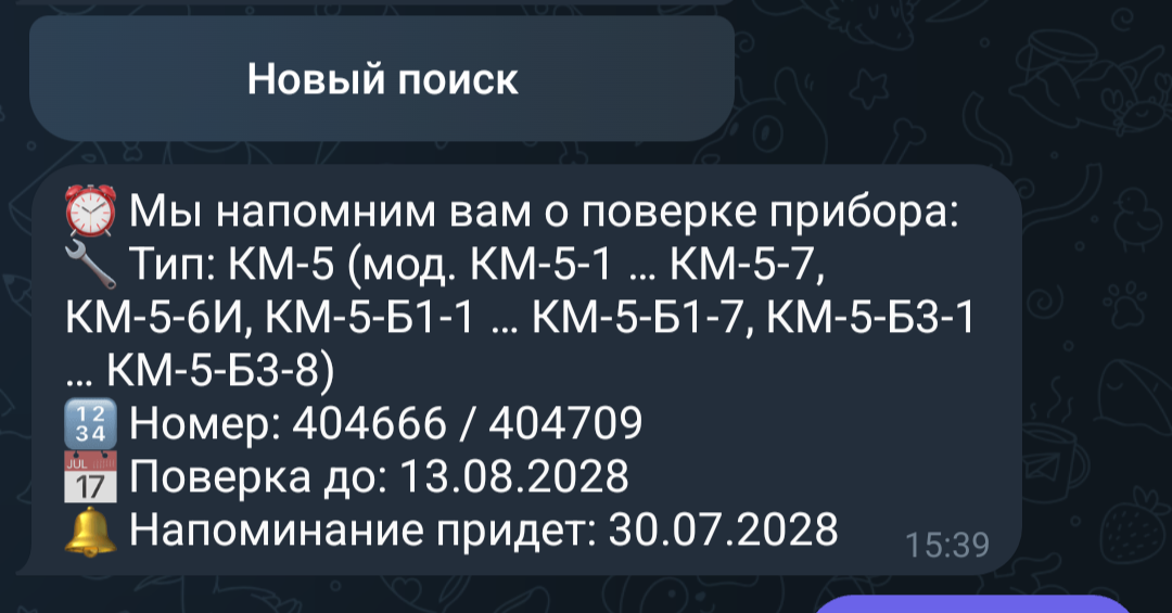 Недавно добавил фишку - отслеживать поверку. Т.е. мы знаем, что она должна пройти вот-вот на днях, но постоянно мониторить нет желания. Тут добавляем средство измерения в лист отслеживания, и бот сам мониторит, и когда поверка пройдет, напишет вам об этом.