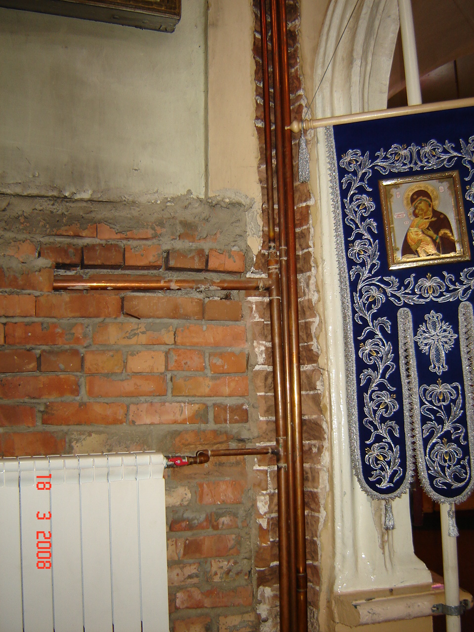 дурацкая это манера отапливать храмы, которые на это не расчитаны нагретый влажный воздух проходит сквозь стены, охлаждается зимой выпадает влага в толще стены и храм постепенно будет разрушаться.