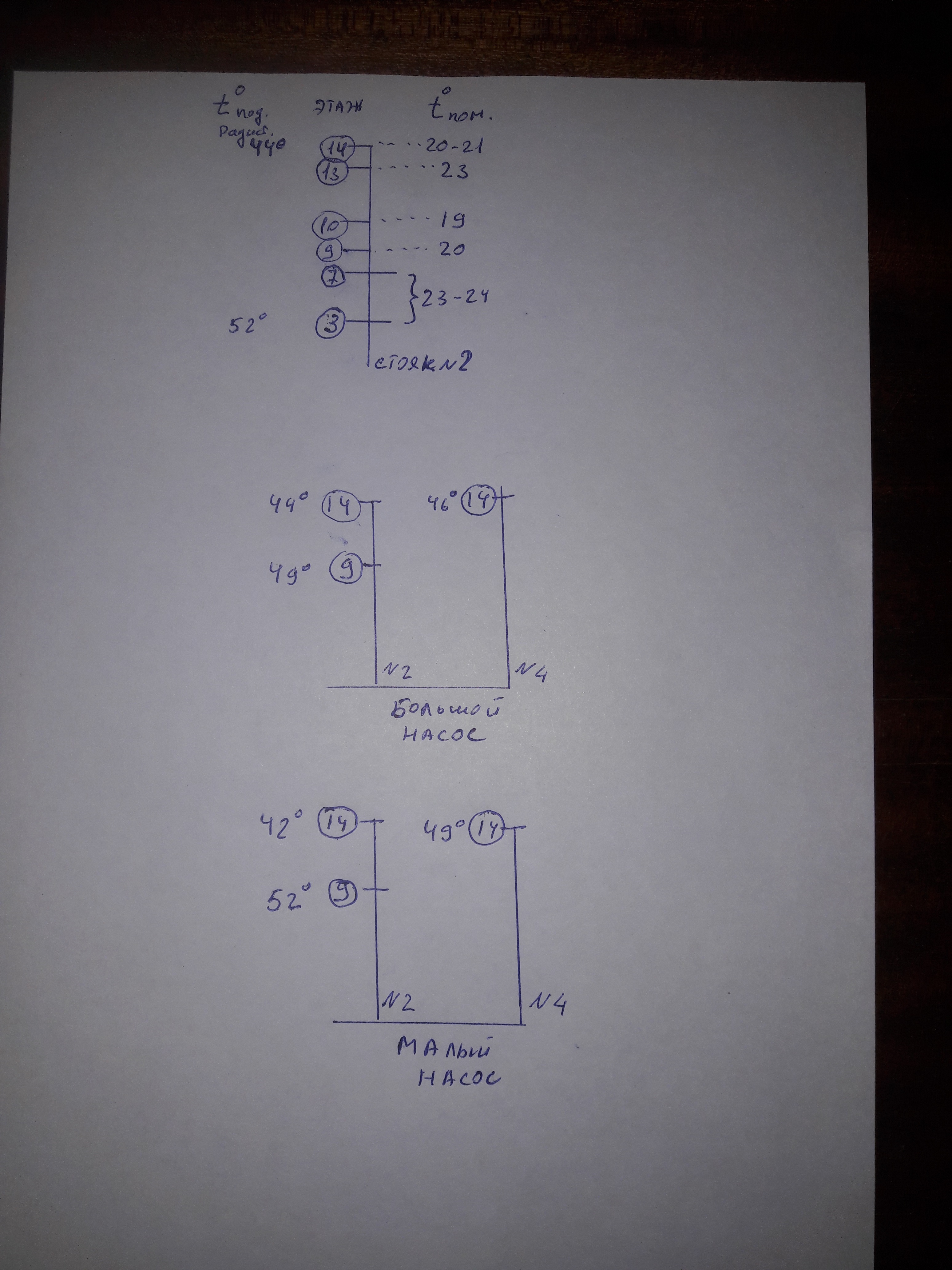 Всем добрый день, провел ревизию батарей на 2 ветке , с 3 по 14 этаж по температуре батарей на подаче 3 этаж в районе 52 градусов и дальше падает до 44 на 14 этаже . по температуре в помешениях на 3-7 этаже градусов 23-24 9 -этаж -20 градусов( по ощущениям холодно) на 10 этаже 19 гадусов(по ощушениям тепло), на 13эт -23гр. на 14эт. 20-21. вообще не понял зависимость. Обратный клапан на малом насосе мёртвый, пока просто задвижку на насосе закрываю.