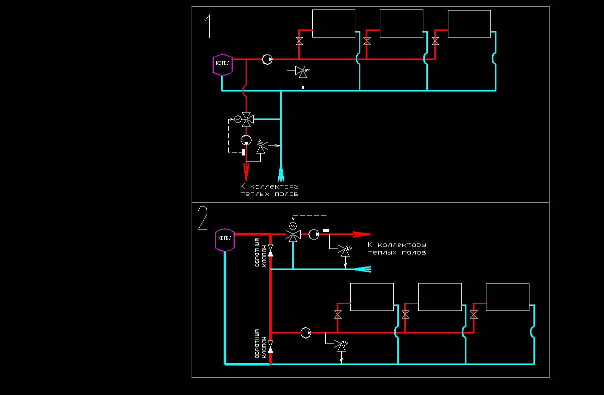 первая рабочая, если котел с маленьким гидравлическим сопротивлением... Если котел водотрубный, типа газовой колонки (это любые атмосферные газовые котлы), то в точке подачи теплоносителя к теплым полам будет самое маленькое давление в системе, а в точке обратки теплых полов - будет давление больше на величину сопротивления котла. В принципе, существует вероятность, что при открывании трехходового клапана теплых полов обратка отопления начнет перетекать через обратку полов-трехходовой кран-подачу теплых полов - на всас насоса отопления, при этом минуя котел. И это не шутка. При потере давления на котле в 5 метров (это будет через год эксплуатации атмосферника) - переток будет настолько сильным, что в теплые полы вообще не будет попадать горячая вода из котла, а греться они будут только обраткой отопления. Сомневающимся просьба распечатать первую схему и проставить значения давления воды на всех трубных узлах, приняв, например, статику 20 метров, перепад в котле 5 метров, перепад в отоплении 5 метров, насос отопления - 11 метров (1 метр на трубах, кранах, фильтре), перепад на полах - 5 метров, насос полов - 7 метров, перепад на 50% открытом трехходовом - например 3 метра... В общем, это реально. Надо будет выбрать насос теплых полов с повышенным перепадом - до 11 метров, как раз компенсировать давление перетока... вторая схема - представляю, как это должно работать. Похоже на недоделанную гидрострелку... мутная какая-то. Но рабочая... я бы посоветовал сделать наоборот - теплые полы поставить после отопления, то есть на рис 2 - поменять их местами. Что это даст: обратка отопления у Вас всегда выше 40 градусов, а на теплые полы вы подаете максимум 30. Поэтому можно с обратки отопления брать воду прямиком на теплые полы. Обратный клапан на отоплении стоит для того, чтобы можно было включать теплые полы, не включая отопление целиком, но это скользкий процесс - очень зависит от того, какой выбран котел. Если проточный атмосферник, то нельзя, если наддувный Будерус с нулевым минимальным протоком (по паспорту), то можно... потому что существуют моменты, когда теплые полы замкнуться сами на себя и работающий насос полов не будет создавать проток через котел (или очень сильно его уменьшит). Для атмосферника - это верная смерть от перегрева.