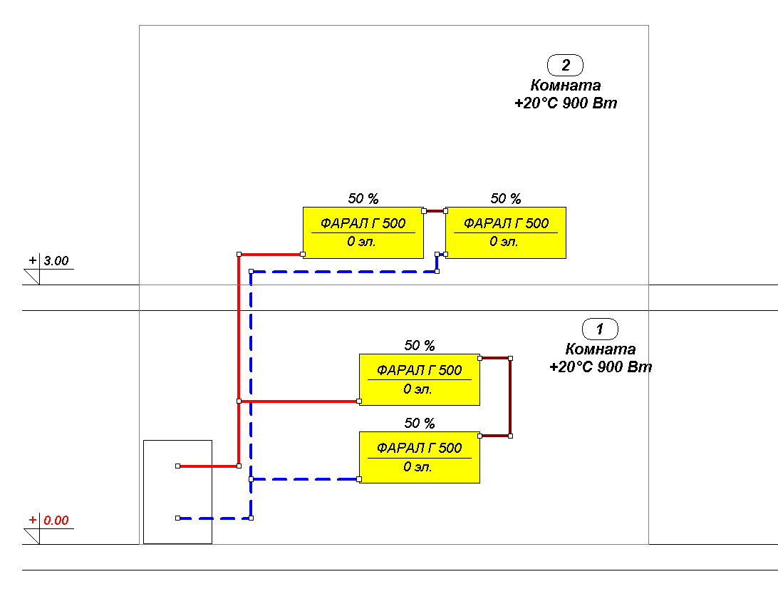 попробуйте его изобразить как один прибор, а нагрузку задайте как на два. в итоге теплоотдачу(площадь) второго берите с запасом.