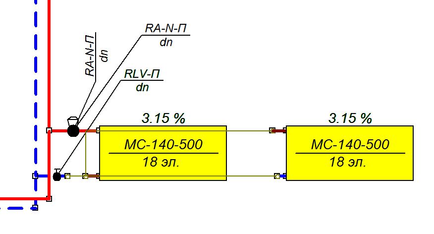 Сама спросила - сама отвечаю (мож кому пригодится) Соединяется так: Обратную подводку от первого прибора чертим однотрубной линией (коричневая 1Т), ее удаленным подключением соединяем с подающей подводкой второго прибора (она тоже 1Т). Обратную подводку второго прибора удаленным подключением подсоединяем к обратной подводке первого прибора.