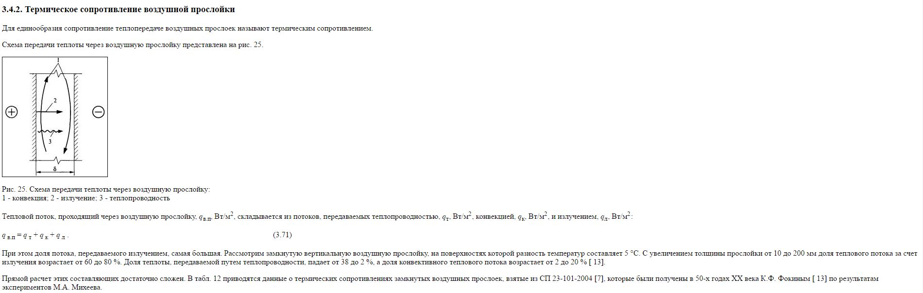 Толщина промежутка, м Вертикальный промежуток и горизонтальный при тепловом потоке снизу вверх Горизонтальный промежуток при тепловом потоке сверху вниз Температура воздуха в промежутке > 0 < 0 > 0 < 0 0,01 0,129 0,146 0,1375 0,155 0,02 0,1375 0,155 0,155 0,189 0,03 0,1375 0,163 0,163 0,206 0,05 0,1375 0,172 0,172 0,224 0,1 0,146 0,181 0,181 0,232 0,15 0,155 0,181 0,189 0,241 0,2 – 0,3 0,155 0,189 0,189 0,241 Примечание. При оклейке одной или обеих поверхностей воздушной прослойки алюминиевой фольгой термическое сопротивление следует увеличивать в 2 раза.