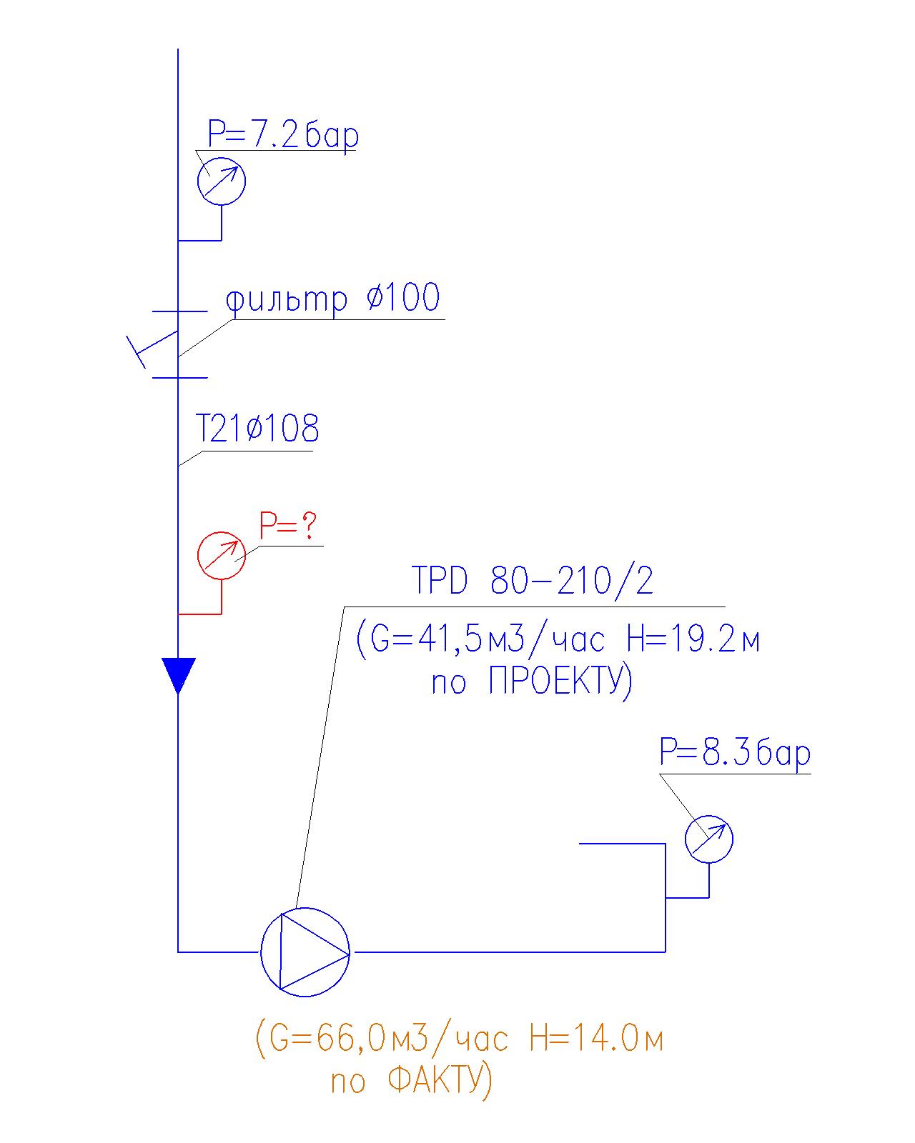 Цитата(инж323 @ 13.2.2009, 9:54) [snapback]352697[/snapback] Или просто расход задерем и ладно, вот шумит только гадость такая. Задерем сопротивление с 14м до 19м. Расход снизится с 65м3/ч до 41,5м3/ч. Цитата(инж323 @ 13.2.2009, 9:54) [snapback]352697[/snapback] ... А сколь на магистралях теряете ... При расходе 41.5 м3/ч скорость в D100-1.47м/с - думаю в пределах нормы. Потери примерно- 0,03м или 290Па/метр трубы. Многовато - но не смертельно т.к. трубы около 6 м, а дальше она расходится на два D100 (см схему). Цитата(KGP123 @ 13.2.2009, 10:15) [snapback]352718[/snapback] Попробуйте начать с 3. Потом снизьте расход до расчетного балансировочным клапаном (указан перед насосом), если шум останется, то похоже его источник ТО. Сэкономили поди. Маленькие размеры-большие гидр. потери компенсируем напором насоса. перед насосом указан фланцевый фильтр тэкофи (не указал на схеме - торопился)