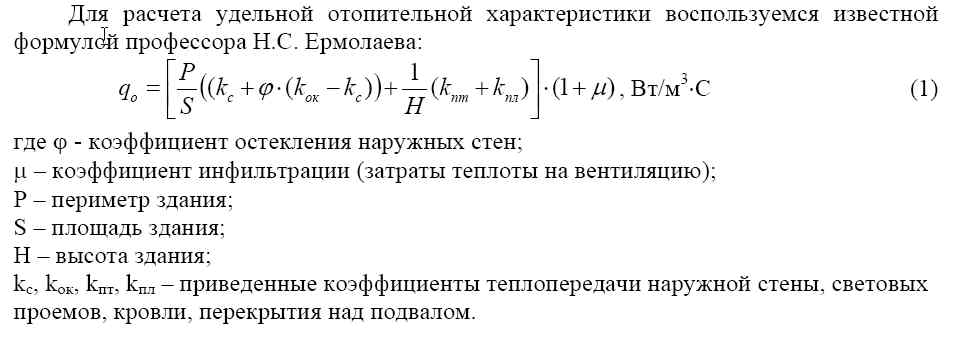 Источник этой формулы - профессор Н.С. Ермолаев. А применять её как раз не надо. Ибо удельные характеристики зданий давным давно определяются по более совершенным методикам.