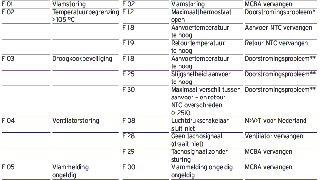 Здравствуйте. Решила не создавать новую тему - пишу тут. У меня в голландской квартире на отопление и ГВС установлен настенный газовый котел Vaillant hr solide 2002 года выпуска. Котел постоянно отключается и показывает ошибку F01. Я уже 4 раза вызывала к нему голландского мастера, он заменил трехходовой, потом еще какую-то штуку, похожую на индукционный клапан, потом блок автоматики, потом какой-то кабель для горелки. Котел продолжает отключаться по несколько раз в день. Голландский мастер провел его полную диагностику по телефону с производителем - все ок. Они разводят руками. Я наблюдала как происходит отключение: котел включается и начинает показывать режимы: 1, 2-включается вентилятор, 3 - розжиг и затык, нет розжига, обратно 2, опять 3, 2, 1, F01. Я жму рестарт и все по-новой. Раза с третьего-четвертого разжигается и работает нормально несколько часов, потом опять выключается. Без отопления даже теплой голландской зимой не весело, ищу новую квартиру. Но все-таки интересно, может кто сталкивался с подобной проблемой и ларчик просто открывается на самом деле? Инструкцию с картинками, но на голландском прилагаю. На русском и даже на английском не нашла.