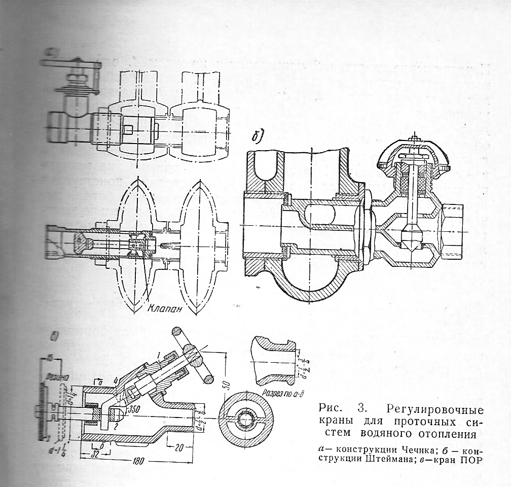 Некоторое продолжение темы забытого регулирования.Поворотный регулировочный кран имеющий поворотную гильзу для бытовой регулировки теплоотдачи прибора.При монтажной регулировке устанавливают колпачок регулятора в требуемое положение для создания необходимого сопротивления на малом циркуляционном кольце в соответствии с расчетом.Для этого снимают винт,шайбу указатель и винт штока,а регулятор поворачивают на заданое число оборотов, фиксируют.Производят обратную манипуляцию по установке винт штока,шайбы указателя.В дальнейшем бытовая регулировка осуществляется поворотом рукоятки по стрелке указателю от пложения "открыт" до положения "закрыт". Для 2х трубных систем требующих повышеных гидравлических сопротивлений предлагается вентильный (профилированый) регулировочный кран аналогичного типа.Не правда ли что-то напоминает современное,а написано это было в 1949году и внедрено в массовом порядке в1951году.