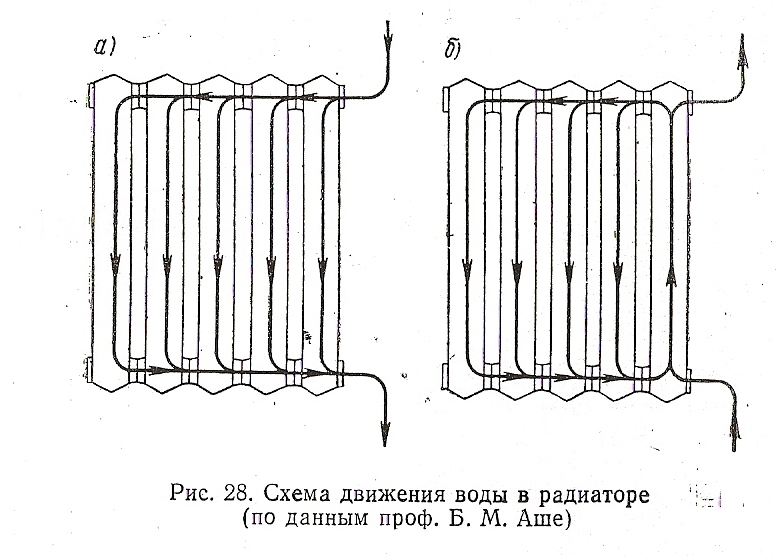 Опытами проф.Аше Б.М. было установленно,что при питании радиатора но схеме снизу- вверх, на поверхности прибора устанавливается температура равная температуре воды выходящей из прибора. Ткак если подвести 130гр и отводить 95гр. то t прибора будет 95гр, а при подаче сверху-вниз она была бы 112,5гр. Очевидно, что Чечик Е.И. использовал именно этот принцип. На рис. показано движение воды в приборах при разных подключениях.Обратите внимание на правый рисунок.