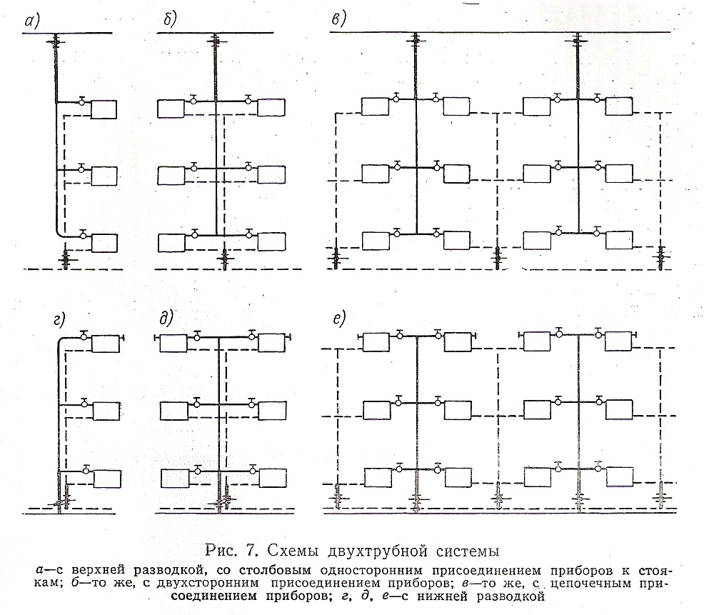 Есть параллельное подключение внутри группы из нескольких ОП - говорим "двухтрубный стояк" - двухтрубная система Есть последовательное подключение внутри группы из нескольких ОП - "однотрубный стояк" Если в системе и те и другие подключения внутри групп ОП - комбинированная система