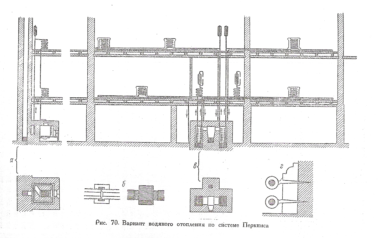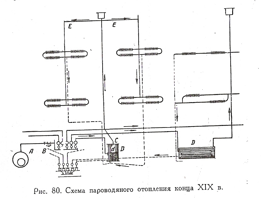 Профессор Чаплин В.М. разработал 1903году совершенно оригинальную систему паро-водо-водяного отопления получившую распространение в Москве.Надеюсь фамилия Чаплин известна читателям этой темы.Схема несколько сложна для восприятия.ВцилиндреС местной системы происходит смешание воды 2х различных температур:более гор. идет из котлаА по труьам а и ответвлениям д,вспрыскивается в нижнюю часть цилиндраС,частично подсасывает хол. воду из обр.трубопров. и повышает гидродинамическое давление в системе.Так же вода подсасывается пароструйным элеватором К и этим элеватором через котел А в магистральные трубопроводы.Не так подробно изложил,но думаю специалистам понятно. Профессор Чаплин В.М. разработал 1903году совершенно оригинальную систему паро-водо-водяного отопления получившую распространение в Москве.Надеюсь фамилия Чаплин известна читателям этой темы.Схема несколько сложна для восприятия.ВцилиндреС местной системы происходит смешание воды 2х различных температур:более гор. идет из котлаА по труьам а и ответвлениям д,вспрыскивается в нижнюю часть цилиндраС,частично подсасывает хол. воду из обр.трубопров. и повышает гидродинамическое давление в системе.Так же вода подсасывается пароструйным элеватором К и этим элеватором через котел А в магистральные трубопроводы.Не так подробно изложил,но думаю специалистам понятно.