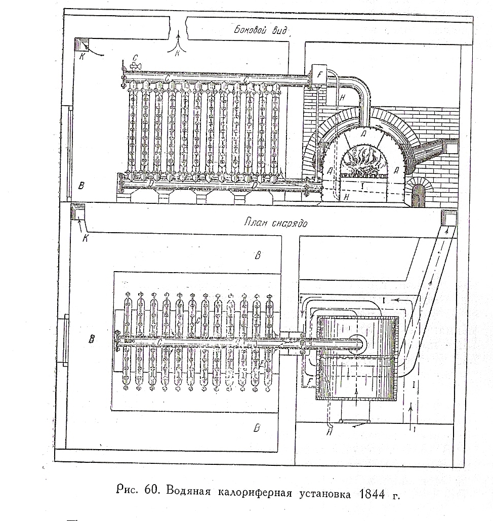 СПАСИБО! Уже перевел. Качество великолепное. Мой ответ. 1844г. Впервые в России применена вода для нагрева воздуха водо-воздушной системы для 2х больших зал обьемом 3000м3. Авторы полковник Фуллон и архитектор Щедрин назвали свой калорифер "снарядом для нагревания помещений посредством кипящей воды". Длина 6м,ширина 4м и высота 2,3м. Вес котла 780кг, вес калорифера около 5тонн.Впервые расширитель присединен не по правилам,а к обратке.По указанию строителей "клицевой сторне можно приделать градусник"Зимой 1844-1845года проверили эфект действия: при наружной темп -20гр. пр Р в помещении было +12гр по Рюмеру.