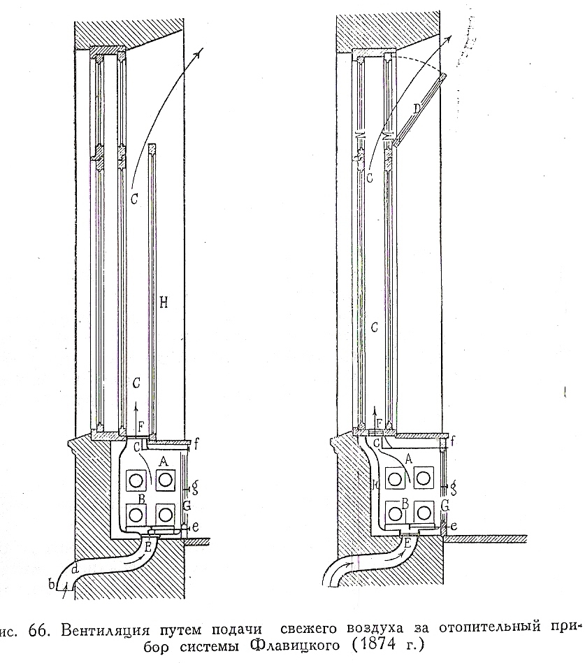 В разных вариантах встречаю децентрализованый приток воздуха непосредственно в отапливаемые помещения у наружной стены,за нагревательным прибором,особенно в старой литературе.Автором этого метода является инж. Флавицкий И. ,который впервые применил такую систему вентиляции в 1874году в нескольких жилых домах Петербурга,а так же в 1875году в Петербургской больнице для душевнобольных.В современном виде я нигде с ней не сталкивался.Почему?