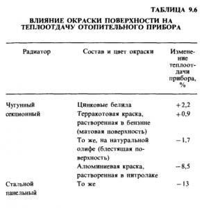 Профессор Б.М.Аше со своими учениками изучал влияние окраски по отношению к неокрашеному чугунному радиатору.В результате этих исследований было установлено,что: терракотовая эмаль уменьшает теплоотдачу на 3,8%; белая эмаль уменьшает теплоотдачу на 1%; цинковые белила уменьшают теплоотдачу на 1%; свинцовые белила уменьшают теплоотдачу на1,3%; матовая зелень уменьшает теплоотдачу па 4,4%; медная бронза уменьшает терлоотдачу на 24%; алюминевая краска уменьшает теплоотдачу на 24,8%. Удивительный был ученый. На лекциях завязывал глаза студентам и требовал чтобы они на ощупь определяли диаметры различных отрезков труб разложеных на столе.