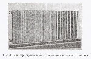 Удивительный радиатор! Ограждения радиаторов приводят к снижению т\отдачи до 15-20%. Приходится увеличивать кол-во секций. В ФРГ применяется новое ограждение которое наоборот увеличивает т\отдачу прибора. Оно изготовлено из аллюминевой полосы которая уложена между секциями по высоте.Благодаря большой т\проводности его они хорошо прогреваются.В полосках сделаны щелевые отверстия, которые значительно увеличивают конвекцию.Испытания показали,что т\отдача прибора увеличивается на 50%.На фото показана обычная длина прибора и левая его часть,которая заменяет полный прибор.1953год.