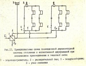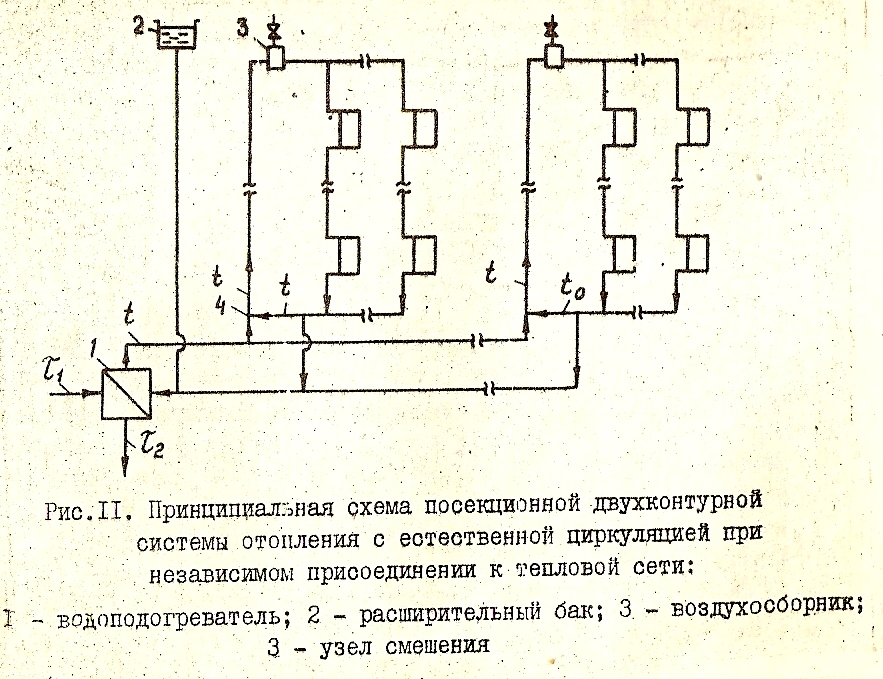 iboqush Вы поспешили немного, я ведь издалека хотел ,а Вы прямо в лоб.Ну да ладно. Сегодня я хотел интересную схему показать из недалекого прошлого.Здесь она гравитационная,но есть вариант элеваторный и без. Я собственно хотел обратить внимание на узел смешания под номером 4. Здесь обратная вода из стояка подмешивается в подающем стояке до необходимых значений t. Практически в системе несколько "элеваторов". Узел смешания прост, это тройник "труба в трубе". Высокотемпературная вода подается прямо в эти узлы смешания. Система эта родилась в "Челябинскгражданпроекте" у Туркина, затем получила одобрение в АКХ им Памфилова.Первоначально ее хотели сделать пофасадной с применением своих регуляторов Т-48,ЭРТ-П,РТК-2216.