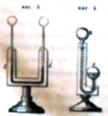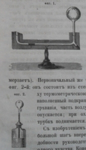 Небольшое продолжение. Когда раз была подана мысль применить расширение тел к измерению теплоты,тогда уже легко было усовершенствовать этот способ и выбрать для него тело более термоскопическое(теплоемкое) чем воздух.Последний хотя во многих отношениях и очень пригоден для этой цели,но он слишком подвержен влиянию атмосферы, даже тогда, если взять два шарика.(фиг.3 и 4)Шарики выдуваются для ускорения нагревания, из тонкого стекла имеют тот важный недостаток,что изменяют свою форму при всяком давлении атмосферы раличиствующем от того,при котором они были приготовлены.Если такие изменения в обоих концах прибора были одинаковы,то это не влекло бы за собой никаких неудобств, но сделать их одинаковыми нельзя, потому-что невозможно придать стеклу обоих шариков одинаковую форму. Ошибся ,повторно фото дал.Необходимо вот это.
