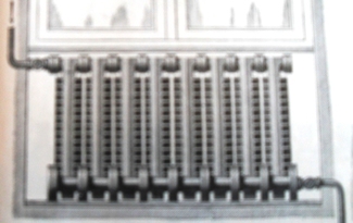По мере развития систем отопления в 19веке появляются и первые отопительные приборы.Они были разнообразными.Главным достоинством их считалась массивность и располагали их в местах установки печей, в углах помещений или у внутренних стен. Такими приборами невозможно было подобрать необходимую мощность прибора.Применение чугунных ребристых труб изобретенных Сан-Галли несколько упростило, но не решило эту задачу. Вопрос подбора мощности прибора тогда решали просто. Перед прибором устанавливали кран, при помощи которого и подбирали расход воды в приборе. Чугунных секционных радиаторов в 1880году еще не было. Задачу эту решили братья Кертинг из Гановера,где у них был свой завод отопительной техники. Именно ими и был изобретен чугунный секционный прибор с косым оребрением который носил название "прибор Кертинга". Братья были в одном шаге от изобретения радиатора,но жизнь повернулась иначе.Прибор Кертинга широко применялся не только в Германии, но и в России, где братья организовали свой завод.Прибор этот был предвестником чугунных колончатых радиаторов. На рис. Вы его видите в собраном виде. Чуть позже я покажу как он был устроен.
