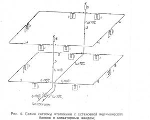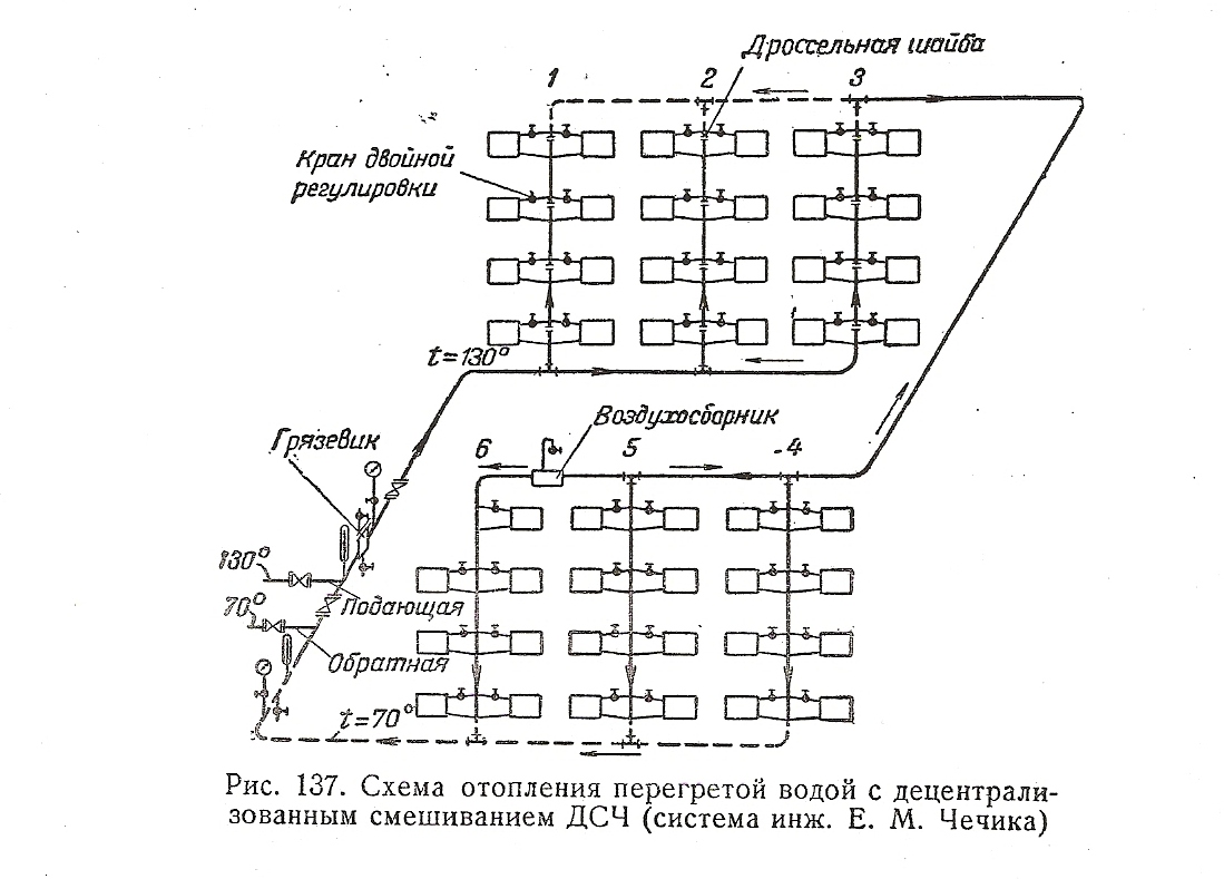 Похоже молодой человек не на ту тему попал. Представляю еще одну интересную систему отопления ДСЧ (децентрализованное смешание Чечика). Автор Чечик Е.И. 1950год. Питание безэлеваторное напрямую от т\сети 130\70. Перегретая вода поступает в первую часть системы по схеме снизу вверх при t-130гр. перемещаясь по стоякам выходит из первой зоны с t-95гр. Далее во вторую зону и через верхнюю разводку поступает в стояки 4,5,6 по схеме сверху вниз и выходит в обратную магистраль при t-70гр. На зам. участках первой зоны установлены диафрагмы, расчитанные на затекание в приборы с учетом выхода из зоны 95гр.