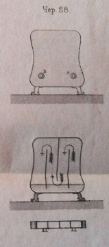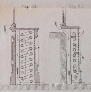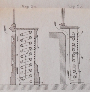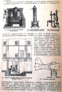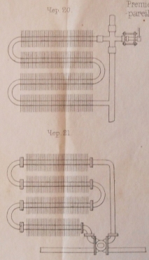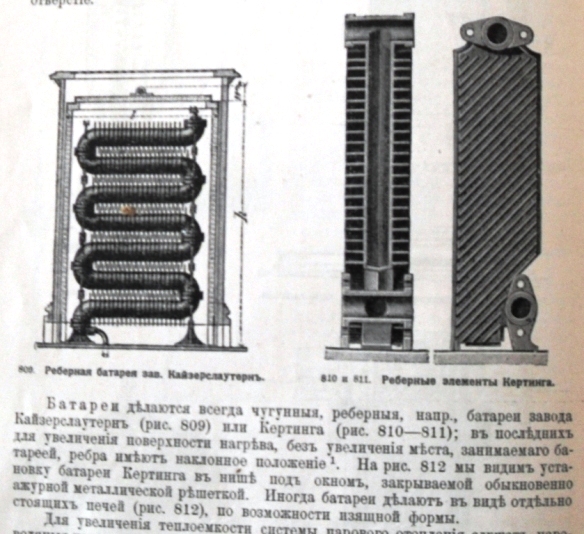 Согласен, картинка конечно не дает полной информации, но и описание ее в книге тоже сокращенное. Поробую передать. Фирма "Кайзерелаутен",довольно известная в те годы, может быть и первая в своем деле изготовила эту систему.Система самого отопления паровая среднего давления, значит3-4 ати, отопительные приборы этой же фирмы показываю на фото. Оребренный змеевик в кожухе с регулятором по воздуху из чугуна. Трубы в системе медные. Воздуховоды практически все в строительном исполнении, на них посажены ОП. Вентиляция принудительная от вентилятора на постоянном токе с реостатом.Два котла фирмы Кёртинг с ее автоматикой, ее я показывал раньше(когда уровень ртути повысится выше черты раздается свисток и включается эл. звонок проведенный к машинисту.) и при этом срабатывает механизм регулятора тяги. На левом и правом разрезах показаны приточные камеры первичного подогрева воздуха для подсоса в вентилятор. Для избежания сквозняков вытяжные отверстия сделаны значительно меньше, чем приточные. Очевидно создавали некий подпор. Внутренние температуры выводились на табло у машиниста с помощью эл. термометров, по ним осуществлялась регулировка, а точнее по трем термометрам из 12. Величина получалась усредненая.