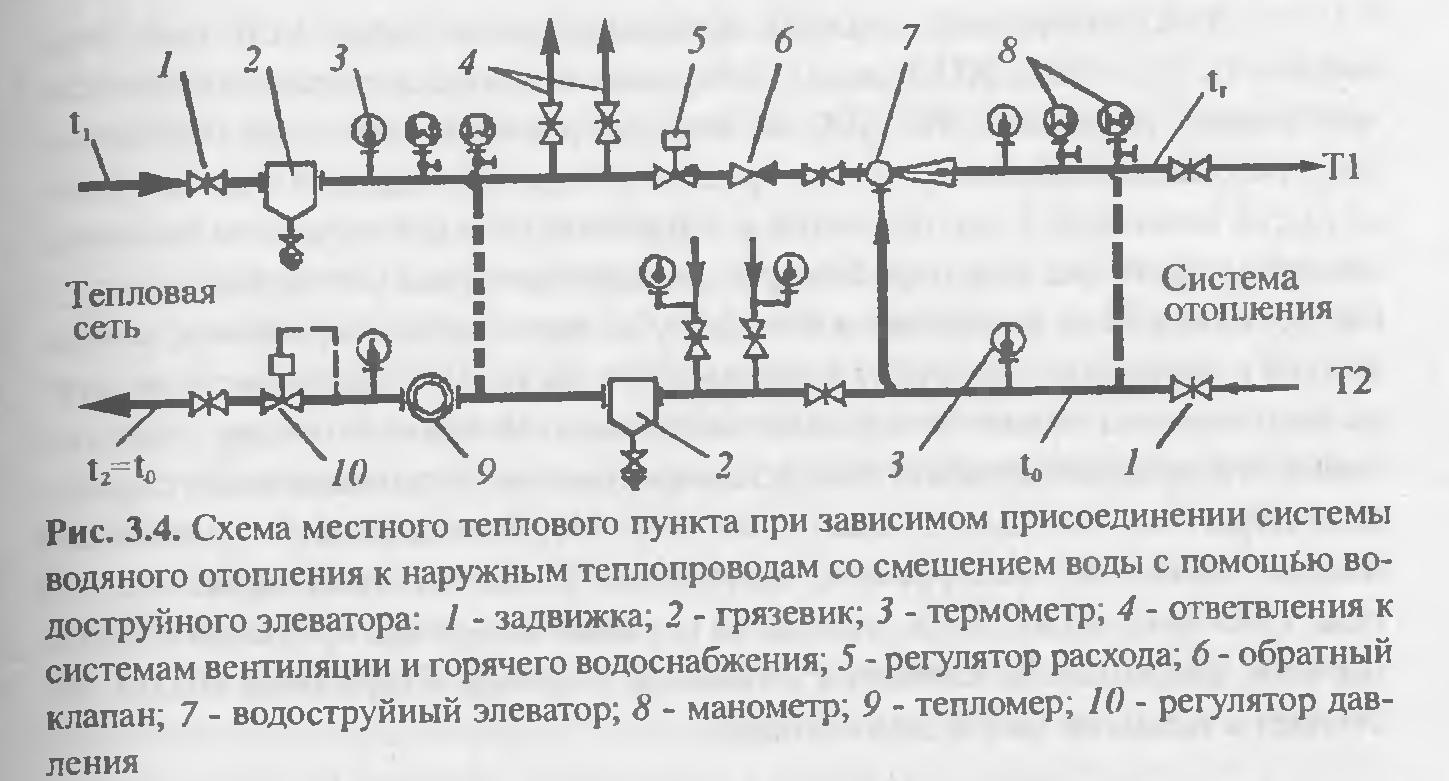 Цитата(Spanky @ 10.11.2009, 12:43)  HeatServ, я повторяю что речь идет не о данном времени, а о ситуации вообще, уже 20 лет подобная ситуация, стало нееемного лучше после замены труб и заглушения подмеса и все. Но в корне нечего не изменилось, а чтобы вы могли судить о прогреве, я написал о результатах замеров теператур. Спасаемся мы открывая помимо всех 4 задвижек еще и сброс, а если сброс закрываем то все стынет. Такой вопрос, есть ли вообще шансы у системы если по прямой 55? Замеры температур не несут информации для понятия "гидравлики", дайте перепад давления, тогда решение Вам дадут через 5 минут. "Спасаемся" не подходит, на прикрепленном рисунке принципиальная схема, все 4 задвижки должны быть открыты ОБЯЗАТЕЛЬНО, можно быстро определить чего у Вас "в натуре" нет - следовательно работоспособность данного узла под большим вопросом. Цитата(Spanky @ 10.11.2009, 12:43)  И еще вопрос, вот вы погрешили на то что СО просаживает ГВС, но с какой головой тогда монтировали такие большие трубы и ставили задвижку такого диаметра? Также от сторожил я слышал что тепло в первые годы после посторойки дома было. Да и вообще кмк это стндартная разводка т.к. не раз видел именно такую схему элеваторного узла в нете. Или подобная система расчитана на 130/70?