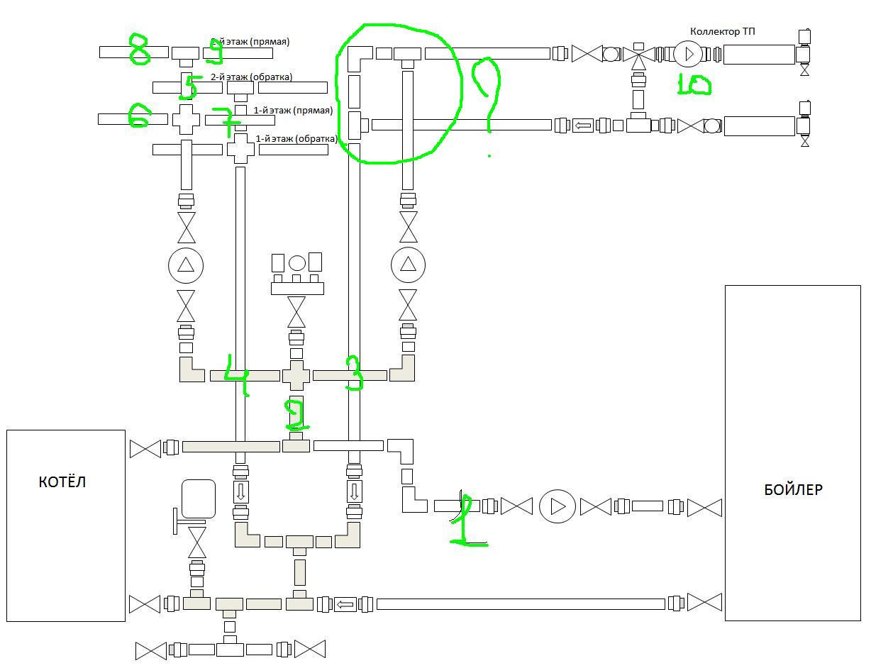 Вы уверенны, что в состоянии без балансировочников, увязать с 1 по 9 участки? Или это "принципиальная" схема? + объясните смысл наличия насоса на ветку ТП если он в контуре есть (10). + почему насосы на подаче? что за параметры СО? и поясните обведенное зеленым.
