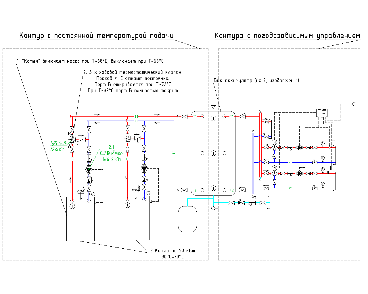 Решил не создавать новую тему, ситуация "+,-" та же: твердотопливник + бак-аккумулятор. 2 котла по 50 кВт на пеллетах, однако, в них также иногда планируется сжигать деревяшки. Посмотрите, пожалуйста, черновую схему - есть ли критические замечания? Для защиты котлов от низкой Т обратки планирую поставить 3-х ходовой термостатический клапан. Проход A-C открыт постоянно. Порт B открывается при Т>72°C При Т>82°C порт B полностью открыт. Кто-нибудь сталкивался с работой таких клапанов? Прежде всего, интересует работоспособность левой части схемы