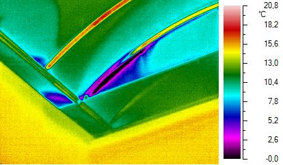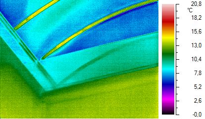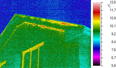 Цитата(анивский @ 13.6.2011, 12:49)  И всё таки мне тоже сомнительны выводы при использовании Blower Door особенно летом.Как вы оцените степень дефекта?И вообщё на основании какой строки нормативного документа назовёте дефектом? СНИП для строителей к эксплуатации помещения ни имеет отношения.По вашей логике и методике дефектными можно признать простые деревянные окна,хотя с другой стороны они должны пропускать воздух для того чтоб естественная вытяжка работала.Сам занимаюсь тепловизионным обследованием,но не вижу практического применения для объективных выводов. Если говорить о приведённом примере, то дефектом является нарушение герметичности пароизоляции. Она или есть или её нет. Подробнее на эту тему написано здесь: http://arefqk.livejournal.com/23845.htmlСНиП к эксплуатации помещения имеет самое прямое отношение - если он нарушен строителем или проектировщиком, то и эксплуатация помещения (проживание в нём) праздником не покажется. Если простые деревянные окна будут причиной повышенной воздухопроницаемости или иметь недостаточное сопротивление теплопередаче, то это однозначно дефект монтажа или проекта. Поэтому их замена требует и пересмотра режима вентиляции. Если Вы занимаетесь тепловизионным обследованием, то наверное, уже пришли к выводу, что тепловизор - не универсальный прибор, имеет ряд ограничений и без дополнительных средств измерения не обойтись. Если Вы занимаетесь тепловизионным обследованием профессионально (я имею ввиду наличие профессиональной техники, обучение, опыт, постоянное развитие в этой области и доход от деятельности), то Вам должно быть интересно как этот вид диагостики применяется в других городах и странах. Например, какие есть зарубежные нормативы и методики (EN, ISO). Там, например, описана методика определения дефекта инфильтрации. Этого в ГОСТе я не видел, но это не значит, что ГОСТ идеален и без недостатков. После ознакомления со стандартами, применяемыми методиками и работой коллег за рубежом можно сделать выводы, что применимо в Ваших условиях, а что - нет. Для примера приведу список датских компаний, одобренных для проведения Blower Door теста. Подавляющее большинство из них также проводят энергоаудит и термографию http://www.energitjenesten.dk/index.php?id=2318&kid=20Для справки - население Дании раза в 3 меньше населения Москвы. Ниже на 2-х термограммах показан дефект потолочного фонаря, который даже при значительном перепаде температур выявить невозможно (если только хватит смелости выйти на скользкую крышу). При создании отрицательного перпада давления он определяется без труда. Для этого не обязательно применять Blower Door. Перепад давления можно достичь и механической вентиляцией. Этот же дефект при гарантированном перепаде давления можно найти и летом. Просто надо понимать что, где и как искать.