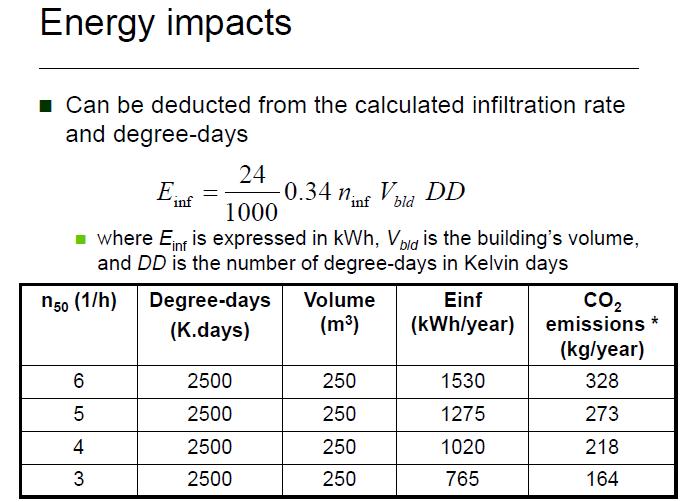 Цитата(Const82 @ 16.6.2011, 2:16)   А в реальных условиях ветер часто с 4 сторон дует? Допустим померили при 50 Па и получили 200 кубов воздуха проникает лишнего. Хорошо, а дальше что? Как из измеренных условий перейти к годовым? Сколько же в год будет попадать лишнего воздуха? Направление ветра имеет свойство меняться. Дефект, необнаруженный при съёмке сегодня, проявится завтра из-за смены направления ветра и в отчёт не попадёт. Т.е. обследование будет некачественным. Этот факт мне приходится объяснять клиенту, заказавшему повторное обследование на этот раз у меня. Если пойти против принципа и скачать "забугорную рекламу", то там можно найти нижеприведённую формулу расчета затрат на отопление, вызванных повышенной кратностью обмена воздуха. Остаётся поставить цифры для своего региона.