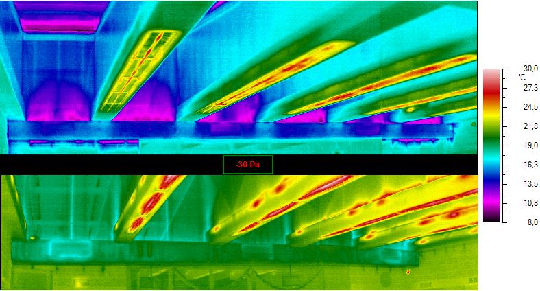 Цитата(irbest @ 15.6.2011, 20:59)   "что-то" подсказывет верно. 50 Ра - это ветер примерно  10 м/с, т.е. вполне реальные условия. Только делая обследование в реальных условиях, ветер не обеспечишь одновременно со всех сторон конструкции. Также перепад давления в здании может меняется с отрицательного на положительный и в зависимости от этажа и стороны. Проведя съёмку в различные моменты времени можно получить различные результаты обследования. Можно потом креститься перед заказчиком что вот этого дефекта не было. На конструкцию воздействуют три силы - ветер, эффект трубы и температурный перепад. Не зная результирующую на качественную съёмку надежды мало. Даже делая простое тепловизионное обследование требуется иметь информацию хотя бы о знаке давления (стандарт EN13187). При гарантированном перепаде (blower door или механическая вентиляция) эта проблема снимается полностью. Примеры термограмм приводил раньше. А в реальных условиях ветер часто с 4 сторон дует? Допустим померили при 50 Па и получили 200 кубов воздуха проникает лишнего. Хорошо, а дальше что? Как из измеренных условий перейти к годовым? Сколько же в год будет попадать лишнего воздуха?