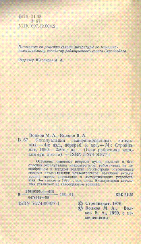 Цитата(sergey-k-pkbdgts @ 11.10.2010, 17:45)  Волков М. А., Волков В. А. Эксплуатация газифицированных котельных.— 4-е изд., лерераб. и доп. — М: Стройиз-дат, 1990.— 256с.: ил. — (Б-ка работника жил.-коммун. хоз-ва). —ISBN 5-274-00877-1