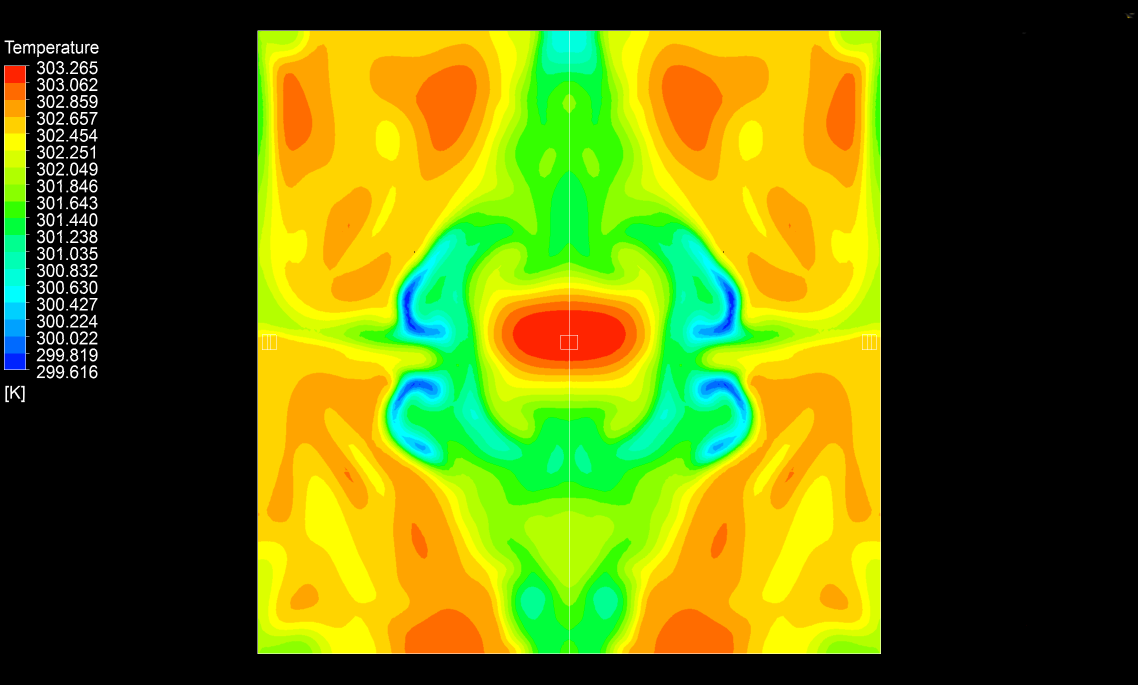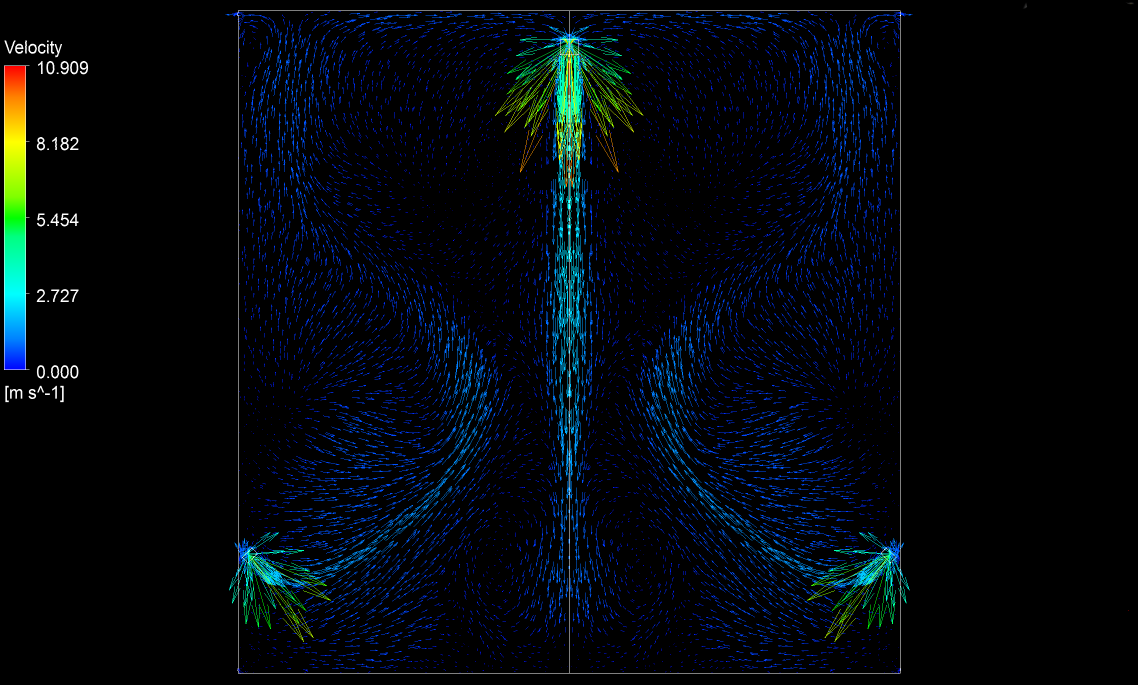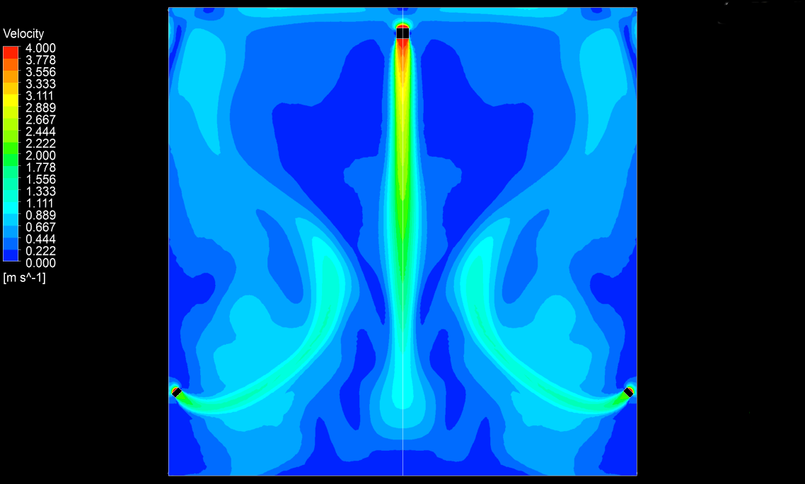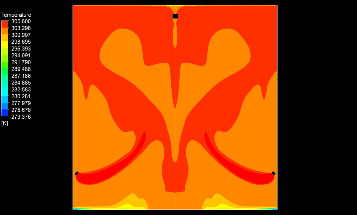 в продолжение разговора. не так давно, для любопытсва выполнили расчет распределения температур и скоростей в высоком помещении. результат меня чесно говоря удивил (скажем так - я ожидал несколько другую картину) нет никакого большого градиента по высоте.... вероятно он имеет место быть при наличии тепловыделений и только естественной конвекции... исходные данные: цех 36 на 36 метров и высотой 28 метров посередине а разных сторонах в плане стоят два АВО на высоте 6 метров (по моему, чет не помню уж....) под потолком висит вентилятор (обычный канальник с расходом порядка 8000) теплопотери через крышу по СНИПу для Питера теплопотери через пол по СНИПу. небольшой сквозняк холодным воздухом по полу помещения извне. расчет делали в АНСИСЕ. через пол годика проверим этот расчет на практике. первая и четвёртая картинки это в плане на отм. 2000, остальное разрез по оси установки оборудования