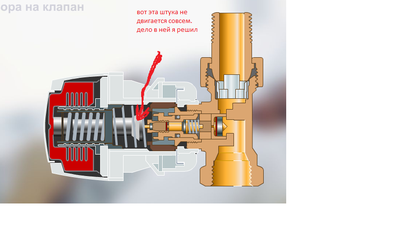 Цитата(Anatol @ 8.1.2011, 14:27)  нет, этот шток как раз отлично работает. просто когда прикручиваешь клапан к термостатическому элементу, он этот шток нажимает до самого конца, т.е. перекрывает и батарея вообще не греет. тут проблема наверно в термостатическом элементе, просто я еще подумал может этот шток как то не правьльно установлен/отрегулирован. http://www.termostat.ru/flash/innova_components.html - вот принцип работы а у меня эта херня (на рисунке указал) без движений нет вру...штука эта движется на так мало что на шток это никак не влияет.....в соседней комнате такой же клапан - там все отлично!