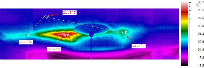 Цитата(kaifsheg @ 3.12.2012, 7:03)  Первое предположение - конечно же протечка от соседей (тёплый пол). Опять же тёплый пол мог бы и просматриваться по всему потолку.... в зависимости от качества утепления. Есть ли соседи вообще? Что сверху? А что за полосы - расходятся влево и вправо от эпицентра (точки С и D)? (если по трубам жб перекрытий, то должно быть думаю равномерней). Перекрытия - монолит ЖБ или пустотелые? Какое отопление? Время года? Двухэтажный особняк. Съёмка в мае. В месте аномалии проходит труба с горячей водой. Первое предположение - виновата труба с горячей водой. У знакомых строителей, которых тоже пригласил клиент, версия была другая. Протекает терраса и вода доходит по перекрытию до трубы с горячей водой. Я осторожно избежал постановки диагноза и порекомендовал для начала вскрыть пол на втором этаже. Строители оказались с инициативой. Вскрыли пол. Увидели трубу и мокрую вату. Убедились, что вода идёт не из трубы, так как убрав мокрую вату, течь в трубе не обнаружили и, уверенные в своём предположении о террасе, её и разобрали. Там было сухо. Через день опять с потолка закапало и меня опять позвали (страховщикам нужен был мой отчёт). Стали проверять на втором этаже санузлы (их там 2). Тепловизор оказался бесполезен. Подвигали мебель в спальне и на стене между ванной комнатой и спальней за шкафом у самого пола бесконтактный датчик влажности показал значительное превышение фона. Протекал тройник холодной воды, замурованный в стену. Страховщики оплатили клиенту мою работу и ремонт (кроме террасы). После этого страховщики стали для меня поставщиком клиентов. Вывод. Не спешить с заключением, не идеализировать тепловидение и применять другие дополнительные методы контроля.