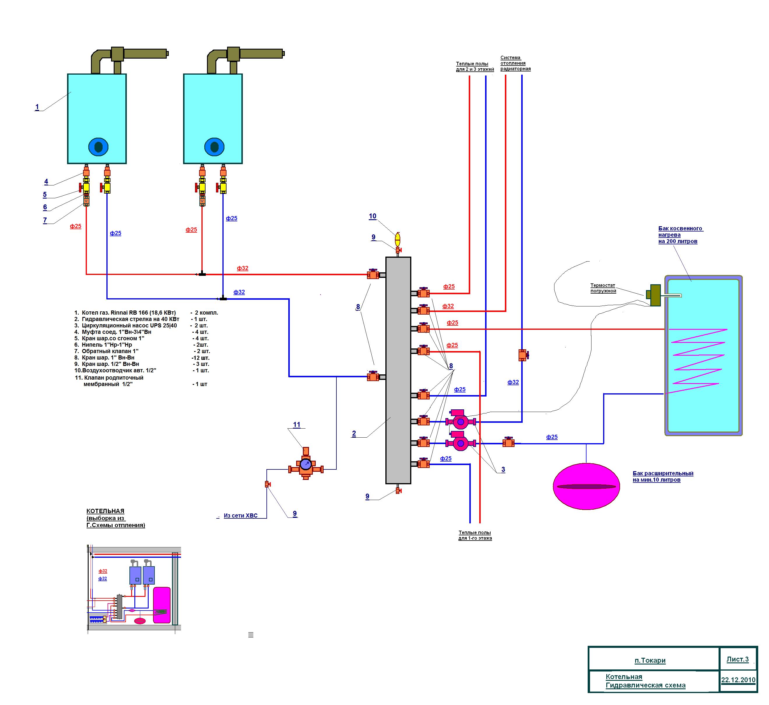 На два котла, с косвеником и двумя контурами. С гидрострелкой.