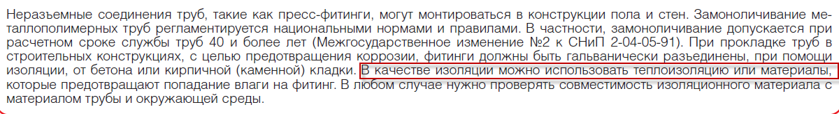 Спасибо большое, добрые люди, за участие! Значит соединение РЕХ-труб пресс-фитингами можно спокойно замоноличивать в полы???Может кто нибудь знает каким документом определяется соответствие ПРЕСС-ФИТИНГОВ неразборным соединениям? Иначе говоря , на что сослаться, когда спросят "почему соединения в полу без люков?"