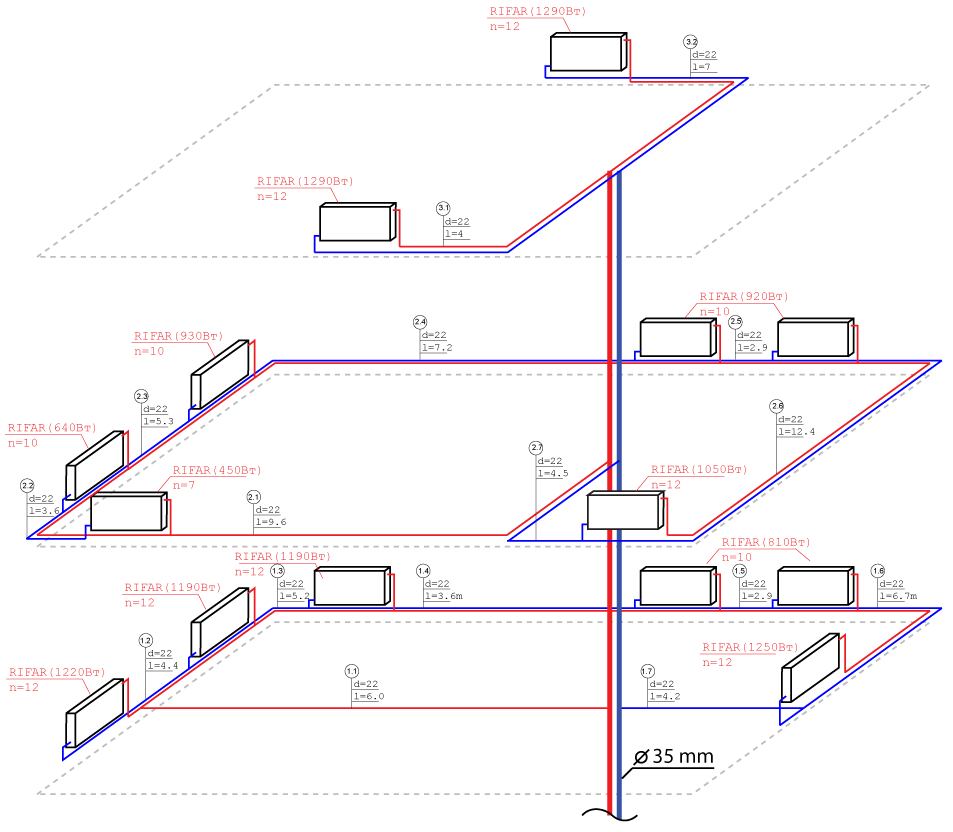 При проектировании использовал систему с попутным движением воды, с одним стояком. Все радиаторы (RIFAR B-500) оснащены термоклапаном oventrop av6 и combi 4. Котел будет расположен в отдельном строении на расстоянии примерно 5 метров от дома. Все трубы в системе - медные. Диаметр труб стояка и магистрали от котла до дома - 35 мм. Этажные ветки - 22 мм. Отводы от веток к радиаторам - 15 мм. Все трубы, кроме отводов к радиаторам утепляются вспененным полиэтиленом с толщиной прослойки 13 мм. Этажные ветки планирую сделать скрытыми и проложить по полу между лагами вдоль стен.