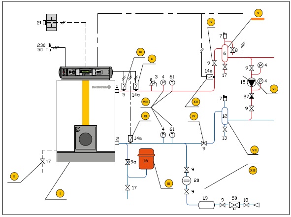 Котел, вероятнее всего, будет или Buderus или Vaillant с дизельной горелкой мощностью 25-30 кВт. Циркуляционный насос - Grundfos Alpha2 60.