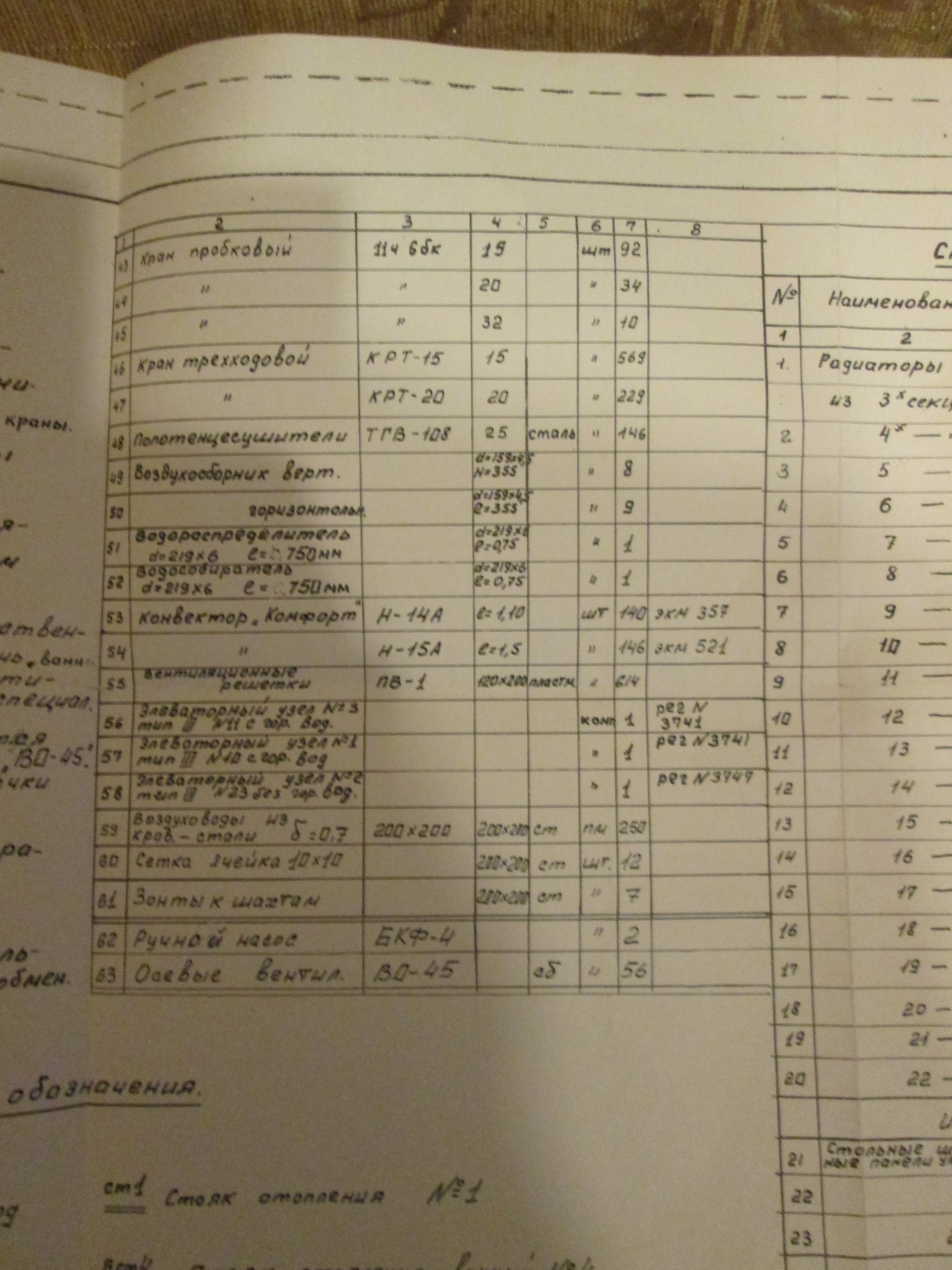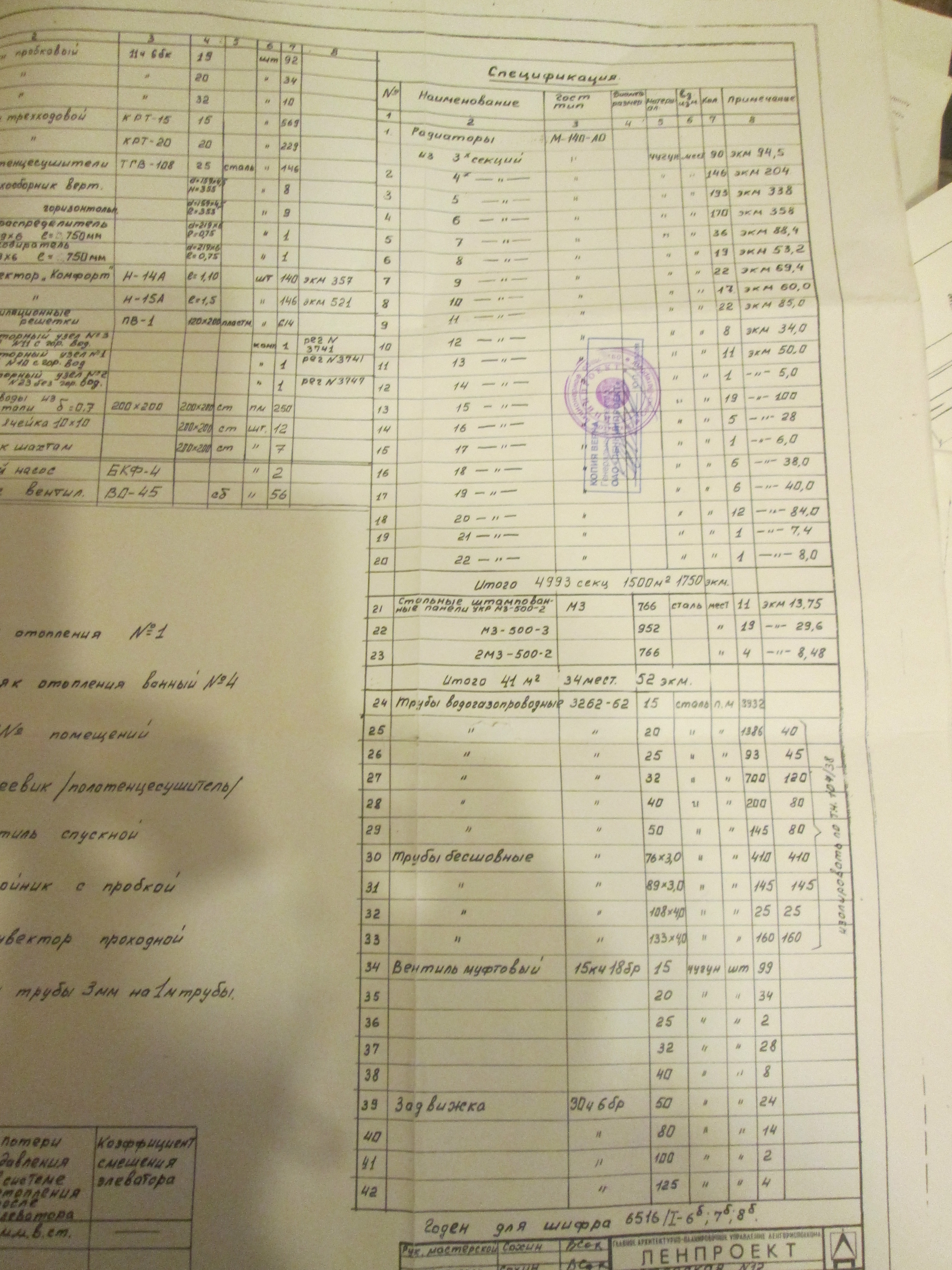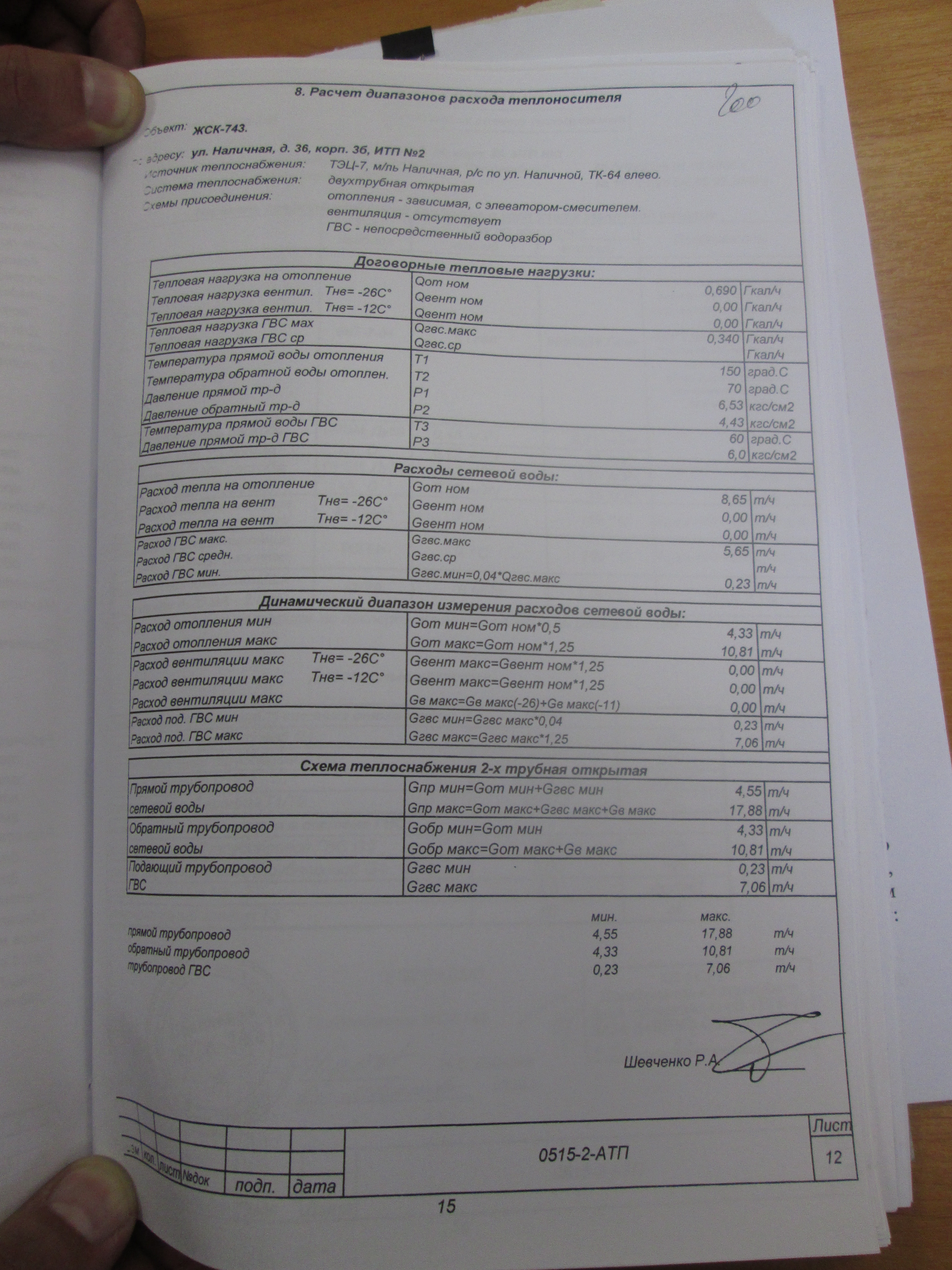 Цитата(awlan @ 29.12.2020, 12:06)  1. Спорить не о чем, давление выдает РСО. 2. Нагрузка - это Гкал. Главное в Вашем Проекте, расход теплоносителя на отопление 8,65 тн./ч. Вот под этот расход(при отключенном ГВС) и крутите свой клапан. Сопло элеватора тоже должно быть рассчитано под этот расход и перепад давлений подачи и обратки. 3. Конечно, это зависит от ограждающих конструкций. Вот РСО выдаёт давление в от 7 до 8 атм. Это - из котельной. Столько же поступает в наш дом. Балансировочник сбивает до 4,5-5,2 атмосфер По последним снятым данным (ноябрь 2020) расход G1 составил 6,75 т. (G2 - 5,63 т) Относительно большего расхода нам говорят, что будет перетоп (если всё правильно помню). Сопло элеватора - 10,9 Цитата(svoroponov @ 29.12.2020, 12:24)  Обратитесь в теплоснабжающую организа[attachment=146632:IMG_7465.JPG]цию . Они вам должны выдать параметры шайбы для установке на вводе в дом. Диаметр отверстия должен быть проверен их инспектором и после установки шайба опломбируется. При ремонте с заменой труб шайбу скорей всего просто демонтировали. (вырезали со старыми трубами и задвижкими), по этому и давление выросло а с ним и шум. Необходимо посмотреть и проект , если диаметры отверстий сопел элеваторов не заданы , только номер элеватора или диаметр указан в мм но со звёздочкой, в таком случае диаметр сопла подбирается под конкретное давление для оптимального смешения. Обычно в проектах по этому поводу делается сноска. По поводу шайбы нас РСО уверяет, что её там не было. При этом до 2009-го года (год установки узла учёта) и 2010 года (год ремонта, в том числе, ИТП) проблем вообще не было Проект прикрепляю. Паспорт ИТП, паспорт системы отопления, спецификация При этом меня смущает, что в договорных нагрузках избыточное давление 6,53/4,43, а проектное - 6,7/3,5