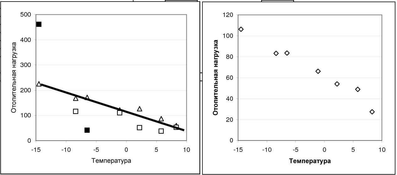 Цитата(burokrat @ 18.11.2011, 19:59)  Суточные, недельные и даже месячные замеры расходов не помогут. А я то же вот думаю, что помогут. Только как минимум пара-тройка измерений (разовых или суточных) при разных температурах наружного воздуха. При измерении получается: расход теплоносителя, температура прямой и обратки (здесь архивы не нужны, а именно значения в момент измерений, причем именно в комплексе с расходом, отдельно они не к чему), также необходим мониторинг температуры внутреннего воздуха. Желательно, конечно, по помещениям с определением средней температуры, или один раз измерить температуру по помещениям, определить степень разрегулираванности системы отопления и мониторить потом в "характерном" помещении, соответствующем средней температуре воздуха в здании. Или измерить температуру воздуха в вытяжной вентиляции (там все смешивется и будет редняя температура по помещения, если, конечно, газовых колонок нет). В общем, способов много. Ну, и, конечно, температура снаружи (хотя бы по метео данным). Зная разницу температур воздуха (t in - t out) и расход теплоты определяется удельная тепловая характеристика здания, по которой можно определить расход на отопление за сезон. Чем больше замеров, тем результат точней. Естественно, полученное значение не будет учитывать отдельные локальные по времени перетопы и недотопы (например при низкой или высокой темпеарутры воздуха), но все же полученное значение будет намного точней, чем расчет по той же авоковской методике, где вентиляция принимается по нормативным значениям. Цитата(burokrat @ 18.11.2011, 22:56)  Сравните теплопотребление за разные месяцы по этим зданиям, тогда поймете, о чем я. Вот, сравнил. Все довольно неплохо. Для левого графика есть правда большое отклонение (черные точки), но это декабрь и январь, субъективный фактор при съеме показаний или оплате. )). Как раз для таких систем можно довольно точно определить расход на отопления по разовым замерам (удельная тепловая характеристика - это угол наклона прямой).