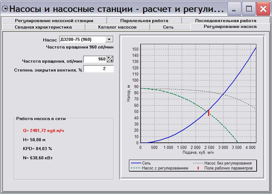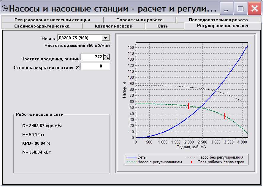 Цитата(Бойко @ 9.12.2011, 23:03)  А зачем тогда "гады" делают нас. станции из 4-6 насосов?.... Поставил чп и дави на всем профиле нагрузок...  турбоприводы, гидромуфты всякие... с жиру "пиндосы" мучуются...? А! Тут еще "квадратная" синусоида разных порядков, ресурс... Вот-вот, у меня суммарная характеристика работы нескольких насосов (в 1 сообщении темы привел пример с одним насосом для упрощения) и заказчик не хочет ставит ЧП на все машины, их 3 в работе постоянно, заказчик предложил показать ему эффективность установки ЧП на 1 или 2 машины. Тут у меня всплыла необходимость складывать характеристики фактически разных насосов, 1 дросселированного и 2 под управлением ЧП или наоборот. Совместная работа может быть только при одинаковых давлениях (условия параллельной работы). Нельзя например, 2 запустить напрямую, а 1м поддавать расход в зависимости от разбора. От этого насоса с ЧП не будет толку, если он не пересечет характеристику 2х работающих напрямую, они его передавят. Подскажите, что за программка, руководство прониклось моими изысканиями и требует рисовать эти графики под разным соусом (2 насоса 3 насоса, с КПД, с мощностью). У меня все в excel эти пертурбации для меня сейчас проблема, а надо быстро.