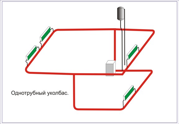 Вы вероятно знакомы с иглой шприца? Очень похоже. Носитель двигаясь по трубе натыкается на врезанную трубу и в силу а) своих гравитационных свойств и б) слегка зауженного сечения вынужден подниматься в радиатор. Будет работать и в ец и принудительно. Про бачок в верхней точке системы класика. Но поскольку это однотрубка с "мешками" радиаторами. То врезал бы в обратку до насоса, перелив в топочную, развоздушники на батареи и если нужно на месте разветвления стояка подачи. На месте стояка подачи можно избежать установки развоздушника если перекроить уклоны так чтоб ветви ушли птичкой в верх.