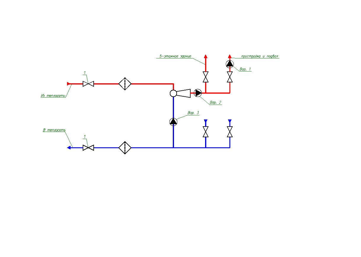 Цитата(KGP1 @ 25.5.2012, 16:03)  Что-то путанно объясняете. Вы первый с таким "резюме". Тем более, на ДАННОМ уважаемом форуме вполне достаточно предложенного рисунка, без обьяснения ..особенностей дополнительного контура циркуляции. (!??) Цитата Насос на подмесе обеспечит треб расход в пристройке и не изменит в 5-этажке при условии установки в контуре 5-этажки БК. Насос и БК и сопло подбираются сизусловия обеспечения распределения тепла в соответствиис тепл. нагрузок и гидр сопротивления.