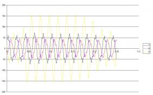 (не смотрите на размерности оси Х. Это я из экселя сворганил. Скачёк тока и падение напряжения происходили в один момент. Просто анализатор записывает синусойды одной продолжительности времени, а среднеквадратичные напряжения другой продолжительности) У нас во время сильного ветра, когда ветер провода замыкает между фазами, на другой фазе лампочка ярче гореть начинает, чем при 220 В. Тут вина потребителя, в том случае если он подключает нагрузку выше ему отпущенной (так что энергосистема не справляется) и вина поставщика, если нагрузка соответствует требованиям, а энергетики не могут обеспечить своевременную регулировку напряжения.