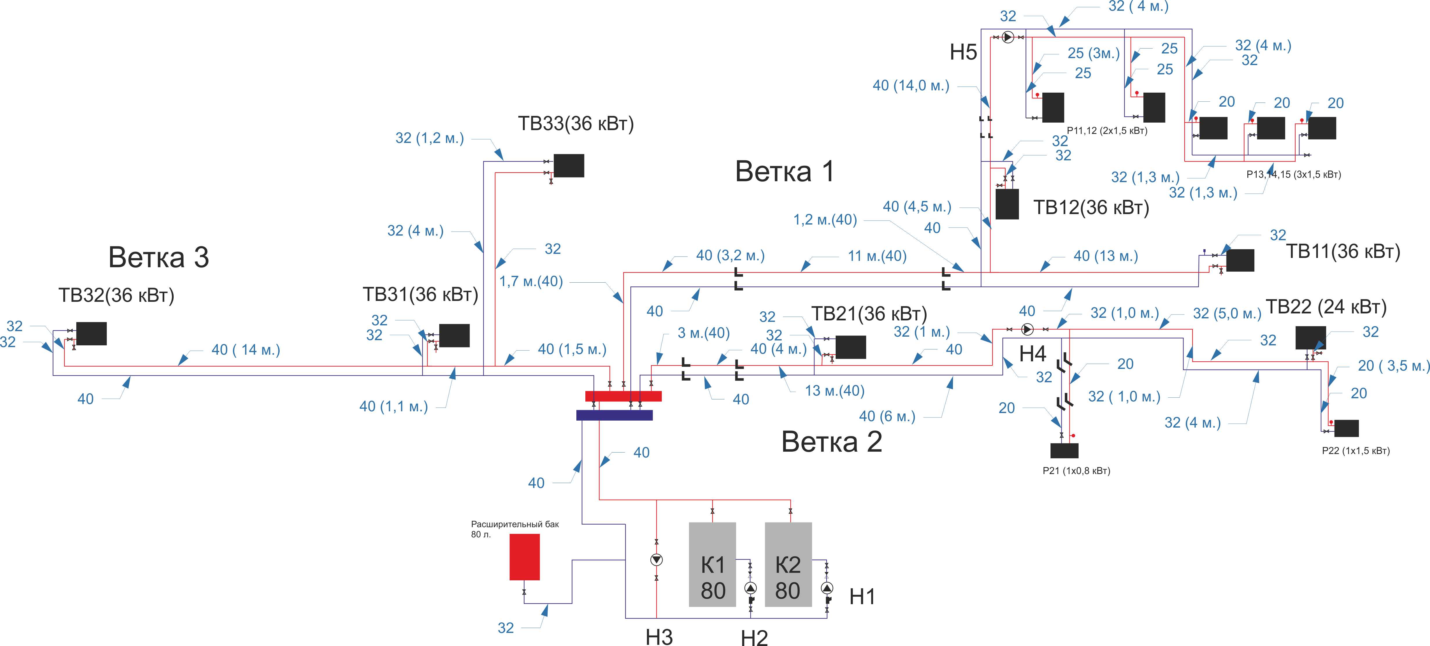 Прикольная расстановка диаметров. У меня товарищь так проектирует- считает, т.е. совсем не считает. Вам нужно просчитать ветки по гидравлике, соотнести с насосами, возможно переделать и увязать м.д. собой, и насчет мощьности котлов непонятно.