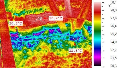 Место съемки освещено плохо, но похоже что не заделана щель между скатом крыши и несущей стеной. Опять же съемка проведена при переменной цветовой развертке, где-то плюс 15 это "жарко", где-то "тепло. Возможно это не просто чердак, а чердак пристройки. Я по крайней мере так трактую теплую зону у одного торца крыши. Опять же ходить по утеплителю нехорошо, его порвать можно или замять.