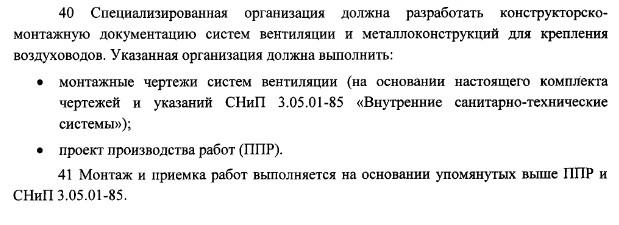 Монтажные чертежи не обязаны быть разработаны. Не обязательно их выполнять. Это остаётся на усмотрение монтажной организации. Прокт (рабочие чертежи) выполняются в объёме, достаточном для выполнения монтажных работ. В нем не концептуально, а детально, с составлением подробной спецификации для заказа, разрабатывается объект проектирования. Выбирается оборудование (не на сколько винтик завинтить, а на сколько Па вентилятор дуть будет), выбираются материалы, специфицируется все. И оборудование подбирается под конкретные условия. дак почему бы эти конкретные условия не обозначить в проекте? Монтажные чертежи есть смысл разрабатывать если есть большое желание одним махом купить все все воздуховоды, привезти их на объект и там не заниматься подгонкой прямых участков по длинне (именно этого и касается монтажный проект, не указать общую длинну воздуховодов, а указать количество участков определённой длинны. все фасонные элементы остаются из спецификации проекта (если конечно не было изменений и если конечно эти фасонные изделия были в спецификации). рис 1. требование по аэродинамике. с точки зрения института расчет производить не обязательно, ибо придут монтажники и все сделают. главно обеспечить возможность. вентилятор помощнее Давать в проекте задание монтажникам расчитать диафрагмы это не есть правильно. Они должны присутствовать в проекте. и в спецификации тоже. рис 2. собственно требование проекта, после которого можно сразу в лоб спрашивать - а где монтажные чертежи? нет? ну дак вы проект не смотрели. досвидания.