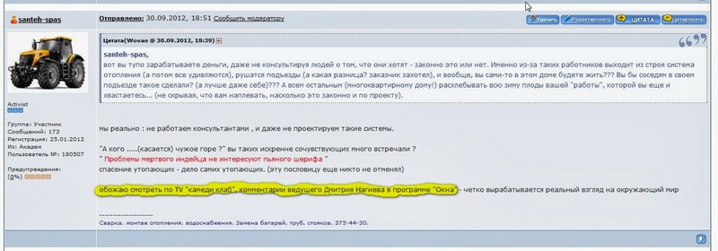 Цитата(Kult_Ra @ 8.10.2013, 12:36)  Одна такая "персона" не есть Россия! Как и одна дождинка не есть дождь. Непонятна совсем Ваша цель (на уровне подсознания?) такого обобщения " Российские кулибины", да ещё "во множественном числе".  Это он и про себя тоже. С удлинителями протока...Можно подумать он может показать СНиП где они прописаны или бумагу где какой-нибудь производитель радиаторов написал их в своих рекомендациях (а еще лучше как штатную деталь в своих радиаторах).